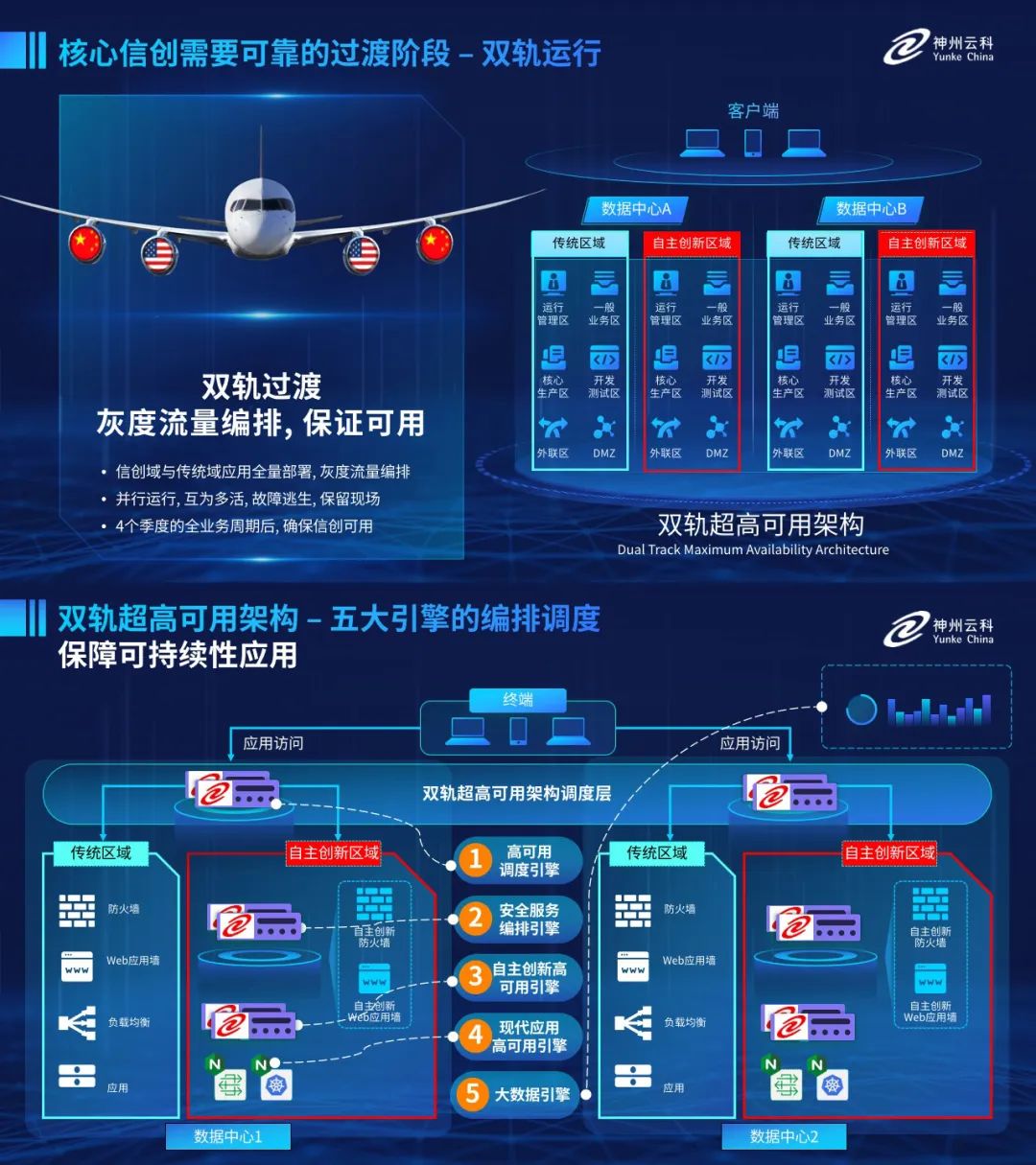 为助力金融业务高质量发展,更好地应对数字经济时代对可持续性的高要求,实现“信创”与“数字化”齐头并进,神州米兰电竞创新性的推出了核心信创·双轨过渡的超高可用架构。该架构在双活数据中心的分区调度基础上,增加信创域和非信创域的分域调度,实行信创域与传统域应用全量部署,使双中心运营变为双中心四区域并行运行,互为多活,将“0到1”的单轨建设道路变为分区分域协同的多活双轨超高可用架构。帮助客户在新架构下,保障“信创”的同时解决性能瓶颈,提升稳定性,保证应用可持续性,最终实现信创区域和非信创区域的平滑过渡,完成国产化替代目标。